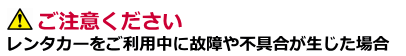 レンタカーをご利用の際に、故障や不具合が生じた場合は、当店までご連絡ください。 即日対応で代車の手配をいたします。ただし、お客様側の使用上による問題が原因での故障時には、その車両の修理期間中における休車補償料の一部として、修理期間・損傷の大小に係らず2〜5万円をご負担頂きますのでご了承ください。 (保険の免責額と自損事故の場合の際に請求する車両の修理代金とは異なります)